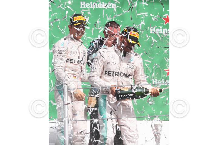 CIUDAD DE MÉXICO, 30OCTUBRE2016.- Lewis Hamilton y Nico Rosberg, ambos de Escudería Mercedes Petronas, y Sebastián Vettel, de Escudería Ferrari, obtuvieron los tres primeros lugares durante la competencia automovilística del “Gran Premio de México 2016”. Al finalizar la premiación el ingeniero Tony Walton de la Escudería Mercedes también fue homenajeado. FOTO: MARÍA JOSÉ MARTÍNEZ /CUARTOSCURO.COM