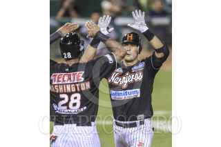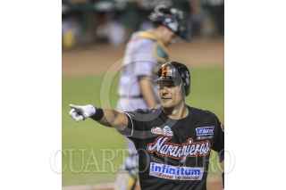 HERMOSILLO, SONORA, 30OCUBRE2016.- Luis Alfonso Garcia celebra su Home Run 140, con el que supera a Ronnie Camacho (139) uno de los mejores peloteros mexicanos de todos los tiempos, durante el 3er. encuentro de la serie de beisbol entre Naranjeros de Hermosillo vs Cañeros de los Mochis, Temporada 2016 2017 de la Liga Mexicana del Pacifico. FOTO: LUIS GUTIÉRREZ / NORTEPHOTO.COM /CUARTOSCURO.COM