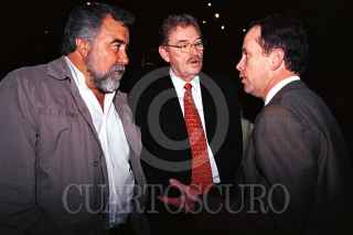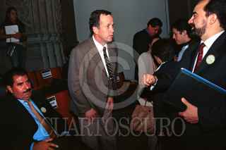 El Presdente de la Comisión de Derechos Humanos del D.F., Emilio Alvarez Icaza, saluda a los dirigentes del PRI y PAN capitalinos, Florentino Castro y José Luis Luege, previo a la presentación de la campaña "Por la no discriminación", realizada por la CDHDF en el Colegio de San Ildefonso. FOTO: Juan Pablo Zamora/CUARTOSCURO.COM