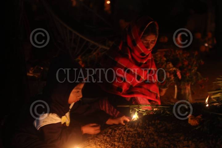 SANTA MARÍA ATZOMPA, OAXACA., 01NOVIEMBRE2016.- Tal y como lo marca la tradición, pobladores del municipio de Santa María Atzompa acuden durante la madrugada de este primero de noviembre al panteón para la "velada a los muertos" y así recibirlos y departir con ellos. Los familiares de los fallecidos llevan bebidas como café, chocolate o incluso mezcal, además de comida, las tumbas las adornan con flores y velas y ahí pernoctan. FOTO: ARTURO PÉREZ ALFONSO /CUARTOSCURO.COM