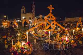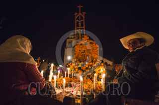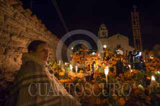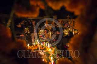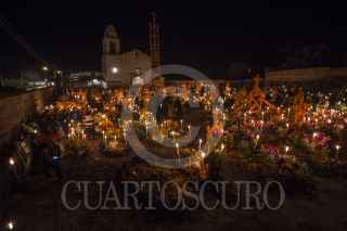 ERONGARÍCUARO, MICHOACÁN, 02NOVIEMBRE2016.- En el pueblo de Arocutín el festejo de la noche de muertos se celebra en el templo de Nuestra Señora de Natividad donde se encuentra un campo santo que es adornado con flor de cempasúchil y la gran mayoria de los familiares de los difuntos se quedan hasta el amanecer, el pueblo recibe un gran afluente de turistas extranjeros y nacionales. FOTO: ALAN ORTEGA /CUARTOSCURO.COM
