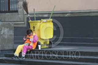 CIUDAD DE MÉXICO, 06NOVIEMBRE2016.- Una empleada de limpieza de la Ciudad de México se coloca un poco de maquillaje antes de empezar su jornada. Esto sobre las escaleras de la antigua sede del Senado de la República. FOTO: GALO CAÑAS /CUARTOSCURO.COM
