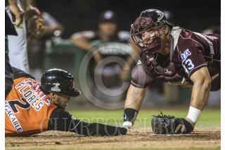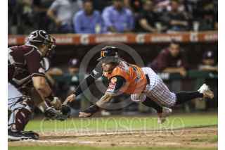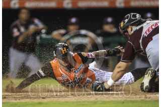 HERMOSILLO, SONORA, 10NOVIEMBRE2016.- Jorge Flores es puesto Out en una barrida apretada en Home en el cierre de la 5ta. entrada, durante el 2do. encuentro de la serie de beisbol entre Tomateros vs Naranjeros. Temporada 2016 2017 de la Liga Mexicana del Pacifico. FOTO: LUIS GUTIÉRREZ /NORTEPHOTO /CUARTOSCURO.COM
