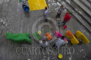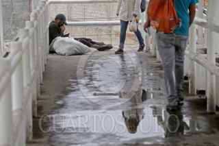 ZAPOPAN, JALISCO. 10NOVIEMBRE2016.- Un indigente come su desayuno, mientras algunas las personas transitan por un puente peatonal, ubicado en las zona de la avenida López Mateos casi al cruce con el Periférico de esta ciudad. FOTO : FERNANDO CARRANZA GARCIA / CUARTOSCURO.COM