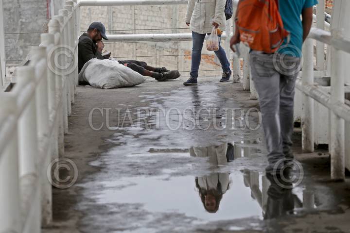 ZAPOPAN, JALISCO. 10NOVIEMBRE2016.- Un indigente come su desayuno, mientras algunas las personas transitan por un puente peatonal, ubicado en las zona de la avenida López Mateos casi al cruce con el Periférico de esta ciudad. FOTO : FERNANDO CARRANZA GARCIA / CUARTOSCURO.COM