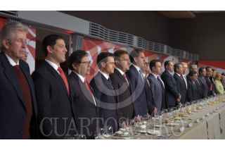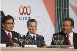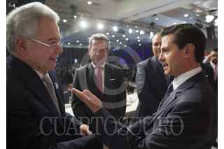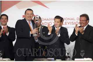 CIUDAD DE MÉXICO, 10NOVIEMBRE2016.- El Presidente Enrique Peña Nieto aseguró hoy, al encabezar la 58ª Semana Nacional de Radio y Televisión, que tiene un fundado optimismo en poder construir una nueva agenda de trabajo en la relación bilateral con los Estados Unidos. En la imagen el mandatario conversa con el empresario de medios Francisco Aguirre. FOTO: PRESIDENCIA /CUARTOSCURO.COM