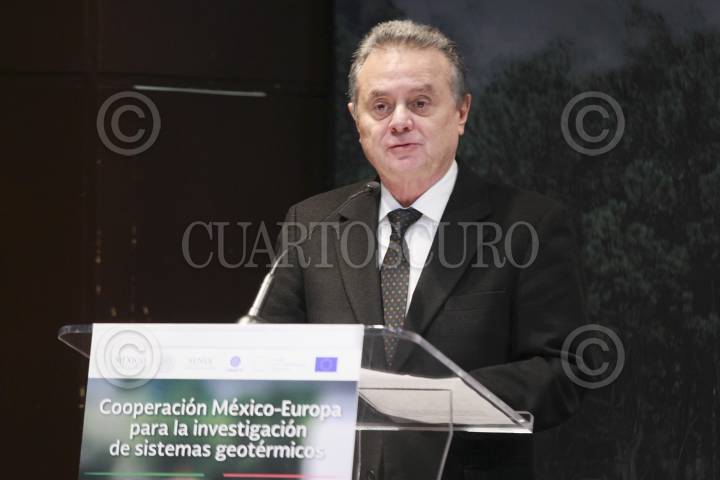 CIUDAD DE MÉXICO, 17NOVIEMBRE2016.- Enrique Cabrero Mendoza, director de Conacyt; Pedro Joaquín Coldwell, secretario de Energía; Andrew Stanley, embajador de la Unión Europea, y Merdano Serna González, rector de la Universidad Michoacana de San Nicólas Hidalgo, ofrecieron detalles de la cooperación entre México y Europa, para la investigación de sistemas geotérmicos. FOTO: CUARTOSCURO.COM