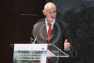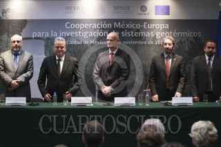 CIUDAD DE MÉXICO, 17NOVIEMBRE2016.- Enrique Cabrero Mendoza, director de Conacyt; Pedro Joaquín Coldwell, secretario de Energía; Andrew Stanley, embajador de la Unión Europea, y Merdano Serna González, rector de la Universidad Michoacana de San Nicólas Hidalgo, ofrecieron detalles de la cooperación entre México y Europa, para la investigación de sistemas geotérmicos. FOTO: CUARTOSCURO.COM