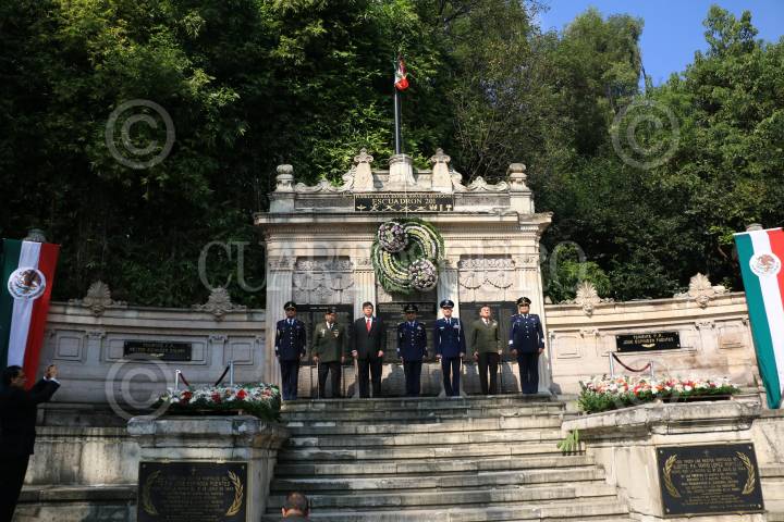 CIUDAD DE MÉXICO, 18NOVIEMBRE2016.- Integrantes del escuadrón 201 acompañados de Carlos Antonio Rodríguez Munguia, general de división diplomado de Estado Mayor y titular de la Fuerza Aérea Mexicana encabezaron la ceremonia alusiva al LXXl aniversario del retorno a la patria del escuadrón 201 realizado en el altar en memoria del escuadrón ubicado en el bosque de Chapultepec. FOTO: SAÚL LÓPEZ /CUARTOSCURO.COM