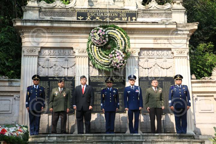 CIUDAD DE MÉXICO, 18NOVIEMBRE2016.- Integrantes del escuadrón 201 acompañados de Carlos Antonio Rodríguez Munguia, general de división diplomado de Estado Mayor y titular de la Fuerza Aérea Mexicana encabezaron la ceremonia alusiva al LXXl aniversario del retorno a la patria del escuadrón 201 realizado en el altar en memoria del escuadrón ubicado en el bosque de Chapultepec. FOTO: SAÚL LÓPEZ /CUARTOSCURO.COM