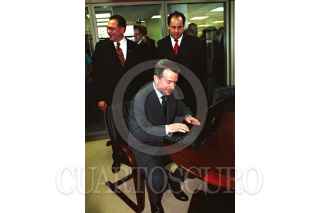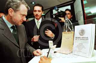 Durante la inaguración de las nuevas instalaciones del Diario Oficial de la Federación, Santiago Creel Miranda, secretario de Gobernación, observa unos ejemplares de 1919 y que forman parte del archivo general del diario oficial. FOTO: Eunice Adorno/CUARTOSCURO.COM