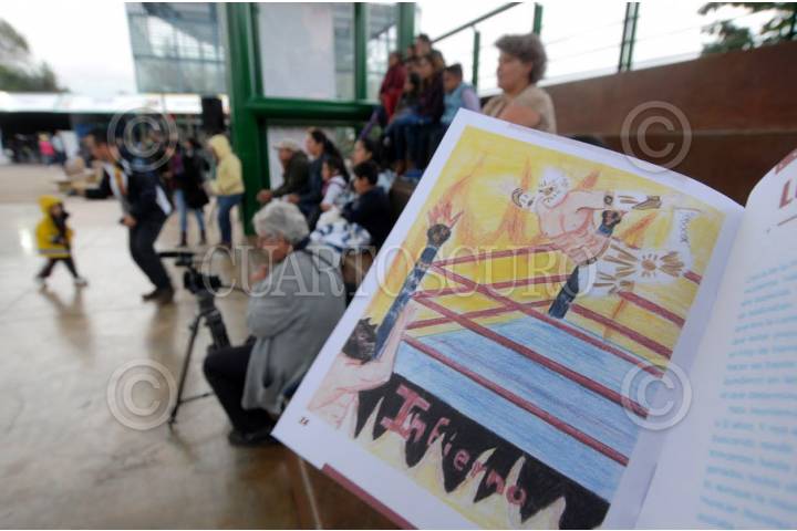 CIUDAD DE MÉXICO, 20NOVIEMBRE2016.- En el Cuentódromo Narnia de la 36 FILIJ en el Parque Bicentenario, se presentó el libro "A 2 de 3 cuartillas. Selección de cuentos", del Consejo Mundial de Lucha Libre (CMLL) y la Secretaría de Cultura. En la foto, Gala Lutteroth, Dragón Rojo y José Carmen Díaz. FOTO: SECRETARÍA DE CULTURA/ CUARTOSCURO.COM