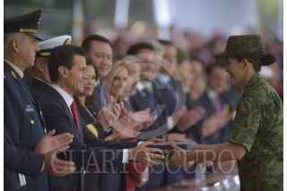 CIUDAD DE MÉXICO, 20NOVIEMBR2016.- Los ascensos son un logro colectivo porque nuestras Fuerzas Armadas son un solo cuerpo, formado por mujeres y hombres que trabajan por un mismo objetivo: servir con entrega y pasión a México, afirmó el Presidente Enrique Peña Nieto, al encabezar la Entrega de Ascensos y Condecoraciones, en el marco del 106º Aniversario de la Revolución Mexicana. María del Rosario Espinoza, medallitas olímpica, recibió un reconocimiento al mérito deportivo. FOTO: PRESIDENCIA /CUARTOSCURO.COM