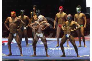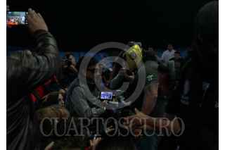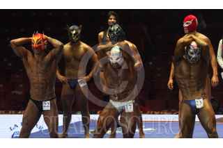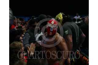 CIUDAD DE MÉXICO, 23NOVIEMBRE2016.- Los luchadores Pierrot jr y Stuka le regalaron sus macaras a Víctor Flores Morales, líder del el Sindicato de Trabajadores Ferrocarrileros de la República Mexicana. FOTO: ANTONIO CRUZ /CUARTOSCURO.COM