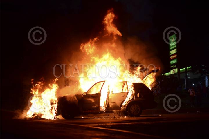 XALAPA, VERACRUZ, 23NOVIEMBRE2016.- Empresarios y sindicalizados quemaron esta noche un automóvil en las afueras de la Secretaría de Finanzas y Planeación del Estado de Veracruz como medida de presión exigiendo el pago de adeudos que mantienen con ellos, los inconformes se manifestaron desde la mañana de este miércoles. FOTO: ALBERTO ROA /CUARTOSCURO.COM