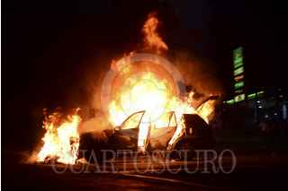 XALAPA, VERACRUZ, 23NOVIEMBRE2016.- Empresarios y sindicalizados quemaron esta noche un automóvil en las afueras de la Secretaría de Finanzas y Planeación del Estado de Veracruz como medida de presión exigiendo el pago de adeudos que mantienen con ellos, los inconformes se manifestaron desde la mañana de este miércoles. FOTO: ALBERTO ROA /CUARTOSCURO.COM