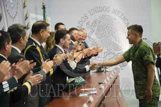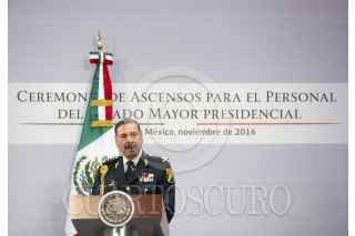 CIUDAD DE MÉXICO, 24NOVIEMBRE2016.- El General de División Diplomado de Estado Mayor, Roberto Miranda Moreno, agradeció al Presidente Enrique Peña Nieto su ascenso al máximo grado dentro de la escala militar. El Primer Mandatario, acompañado de su esposa, Angélica Rivera de Peña, encabezó la ceremonia de Ascensos al Personal del Estado Mayor Presidencial. FOTO: PRESIDENCIA /CUARTOSCURO.COM