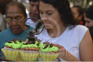CHILPANCINGO, GUERRERO, 28NOVIEMBRE2016.- Estudiantes organizan por segunda ocasión festival gastronómico–cultural “Chapulín Organero”, en el zócalo. Los insectos utilizados en la muestra se cosecharon en Xochilapa, municipio de Eduardo Neri, y fueron utilizados en diversos platillos como; cupcakes, tortas acompañados de salsa, y los tradicionales con solo sal y limón. FOTO: JOSÉ I. HERNÁNDEZ /CUARTOSCURO.COM