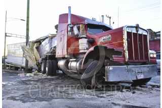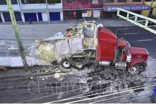CIUDAD DE MÉXICO, 29NOVIEMBRE2016.- Un tráiler se estrellado contra la barra de contención en Eje Cinco y Eje 3 Oriente, en la colonia Apatlaco. La unidad de carga que transportaba grenetina había sido robado de la Central de Abastos. FOTO: ARMANDO MONROY /CUARTOSCURO.COM