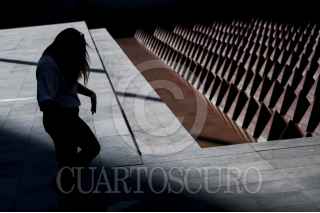 CIUDAD DE MÉXICO, 03DICIEMBRE2016.- La silueta de una joven que baila en la sombra contrasta con la fuente de pirámides que reciben los rayos del Sol en la plaza Juárez. FOTO: DIEGO SIMÓN SÁNCHEZ /CUARTOSCURO.COM