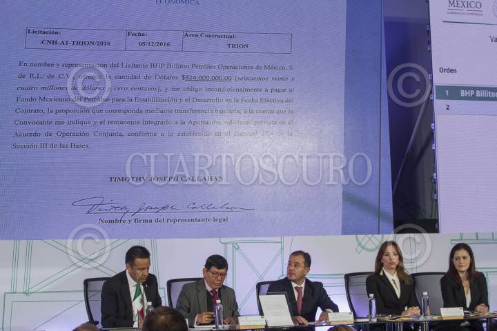 CIUDAD DE MÉXICO, 05DICIEMBRE2016.- Timothy Joseph Callahan, representante de la empresa BHP Billition Petróleo Operaciones de México, presentó la oferta ganadora de la licitación Trion de Pemex, la cual se realizó esta mañana en el Centro Banamex. La empresa australiana se convirtió en la primera socia formal de Petróleos Mexicanos. En la imagen loa compañan Pedro Joaquín Coldwell, secretario de Energía, el titular de la paraestatal José Antonio González Anaya, y Juan Carlos Zepeda, presidente de la Comisión Nacional de Hidrocarburos. FOTO: ISAAC ESQUIVEL /CUARTOSCURO.COM