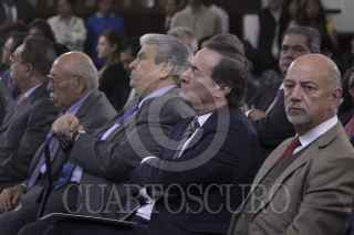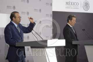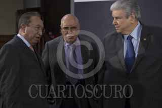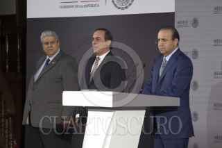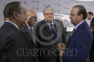 CIUDAD DE MÉXICO, 05DICIEMBRE2016.- Isaías González Cuevas, dirigente de la Confederación Nacional Campesina (CNC); Abel Domínguez Rivero, dirigente del Congreso del Trabajo; Carlos Aceves del Olmo, director general de la Confederación de Trabajadores de México (CTM), y Alfonso Navarrete Prida, secretario de Trabajo y Previsión Social, durante la conferencia de prensa para establecer los avances y las condiciones respecto al salario mínimo y la relación entre empresarios y trabajadores. FOTO: GALO CAÑAS /CUARTOSCURO.COM
