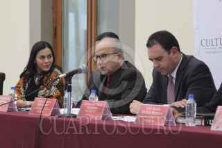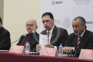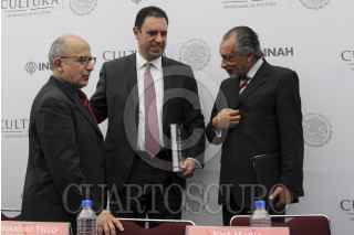 CIUDAD DE MÉXICO, 06DICIEMBRE2016.- Diego Prieto Hernández, secretario técnico y encargado del Despacho de dirección general del Instituto Nacional de Antropología e Historia (INAH); Enrique Guadalupe Flores, presidente municipal de Guadalupe; José María Muñoz, coordinador nacional de centros del INAH, y Alejandro Tello Cristerna, gobernador constitucional de Zacatecas, al termino de la conferencia de prensa, presentada en el Museo Nacional de Historia, para anunciar las actividades y festejos por los 100 años de existencia del Museo de Guadalupe Zacatecas. FOTO: GALO CAÑAS /CUARTOSCURO.COM