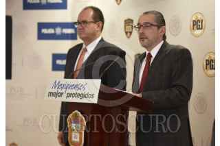 TOLUCA, ESTADO DE MÉXICO, 06DICIEMBRE2016.- Jaime Alejandro Gómez Sánchez, titular de la Procuraduría General de Justicia del Estado de México, informó en conferencia de prensa la detención de los presuntos responsables del homicidio del dueño de la empresa de transporte público Intermetropolitano, Guillermo Rojas Rojas y su hijo, ocurrido el pasado 24 de Noviembre. FOTO: PILAR AGUILAR /CUARTOSCURO.COM