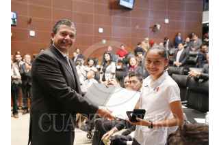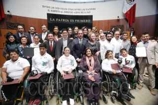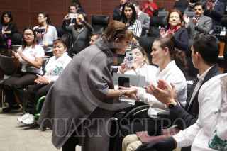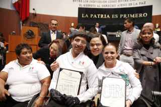 CIUDAD DE MÉXICO, 13DICIEMBRE2016.- En el Senado de la República se les entregaron reconocimientos a medallista olímpicos que participaron en la justa de Río 2016. En la imagen la senadora María Gómez del Campo con los atletas Jesús Hernández Hernández y Nely Edith Miranda Herrera. FOTO: CUARTOSCURO.COM