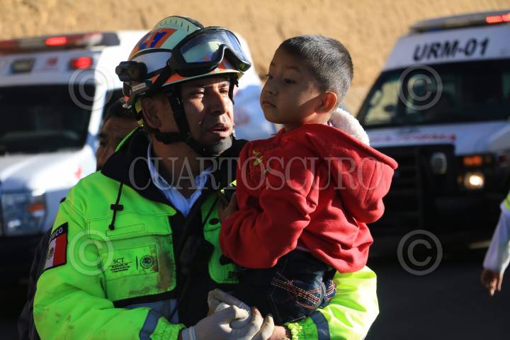 CIUDAD DE MÉXICO, 20DICIEMBRE2016.- Una persona muerta y 42 personas lesionadas lesionadas fue el saldo de una voladura de un autobús que circulaba sobre el kilómetro 42 de la autopista México-Puebla, servicio de emergencia de todas las corporaciones auxiliaron en el percance asi como cuatro helicópteros del escuadrón Cóndores y Relámpagos. En la imagen un paramedico de Capufe tranquiliza a un niño que viajaba en el autobús, su papá, no alcanzó traslado aéreo. FOTO: SAÚL LÓPEZ /CUARTOSCURO.COM