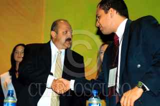 Reyes Taméz, secretario de Educación Pública, saluda a Edwin Valdés, representante de Consejo Mexicano de la Juventud, al iniciar el encuentro nacional juvenil ¨Ni un paso atrás.. todo por la transición¨, en el World Trade Center. FOTO: Moisés Pablo/CUARTOSCURO.COM
