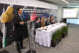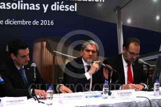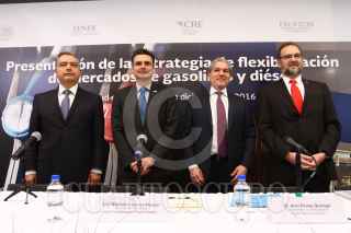 CIUDAD DE MÉXICO, 21DICIEMBRE2016.- Rafael Ochoa, subprocurador jurídico de la Procuraduría Federal del Consumidor, Guillermo García Alcocer, Comisionado Presidente de la Comisión Reguladora de Energía (CRE), Aldo Flores Quiroga, subsecretario de Hidrocarburos de la Secretaria de Energía y Carlos Murrieta Cummings, Director General de Pemex Transformación Industrial, dieron detalles a medio de comunicación sobre la nueva "Estrategia de Flexibilización de Mercados de Gasolinas y Diésel", realizada en la CRE. FOTO: ADOLFO VLADIMIR /CUARTOSCURO.COM