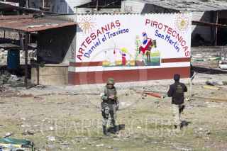TULTEPEC, ESTADO DE MÉXICO, 21DICIEMBRE2016.- Suman 32 muertes tras la explosión, el día de ayer, en el Mercado de Pirotecnia San Pablito Tultepec. Oficiales de la policía estatal y el ejército continúan resguardando la zona hasta que terminen los labores de peritaje. El gobernado Eruviel Ávila declaró que el gobierno apoyara a los comerciantes. FOTO: GALO CAÑAS /CUARTOSCURO.COM