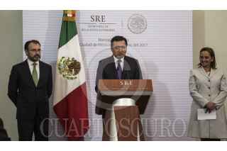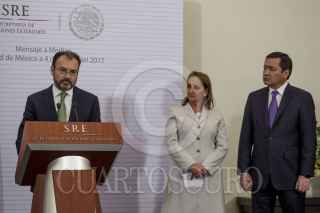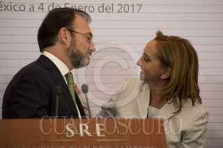 CUIDAD DE MÉXICO., 04ENERO2017.- Miguel Ángel Osorio Chong, Secretario de Gobernación, Luis Videgaray nuevo Secretario de Relaciones Exteriores y Claudia Ruiz Massieu ex Secretaria de Relaciones Exteriores, realizaron una conferencia de prensa para hacer la transición en los cambios del gabinete del presidente Enrique Peña Nieto. FOTO: TERCERO DÍAZ /CUARTOSCURO.COM