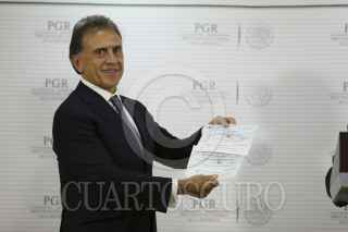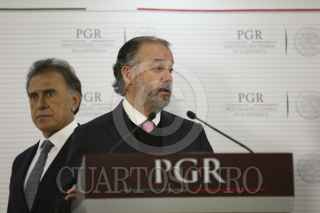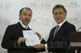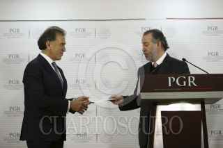 CIUDAD DE MÉXICO, 10ENERO2017.- Miguel Ángel Yunes, gobernador de Veracruz, y Raúl Cervántes Andrade, Procurador General de la República, encabezaron una conferencia de prensa en la cual el abogado de la nación le entregó unos cheques al ejecutivo veracruzano que son partes de los recursos recuperados por parte de la PGR yq ue fueron desviados en el gobierno de Javier Duarte de Ochoa. FOTO: CUARTOSCURO.COM