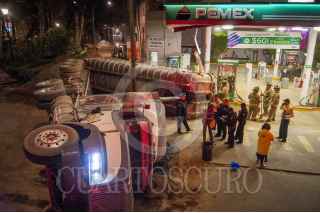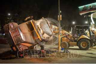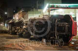 CIUDAD DE MÉXICO, 17ENERO2017.- Un trailer se volcó frente a una gasolinera que se encuentra en las calles de Morelia y Puebla, en la colonia Roma Norte. Bomberos de la ciudad de México acudieron a levantar el vehiculo, el cual estaba estacionado para descargar tepetate para las obras en algunas vialidades de dicha colonia. FOTO: DIEGO SIMÓN SÁNCHEZ /CUARTOSCURO.COM