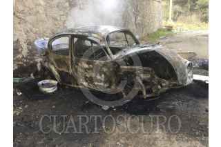 TLAXCALA, TLAXCALA, 19ENERO2017.- Un Volks Wagen se incendio tras ser impactado por un autobús de ATAH, que tras chocarlo lo arrojó al fondo de una barranca entre dos puentes. No se registraron lesionados. El percance ocurrió a las ocho de la mañana a la altura del kilómetro 19+300 de la carretera a cuatro carriles Vía Corta Chiautempan-Puebla. FOTO: JORGE LEZAMA /CUARTOSCURO.COM