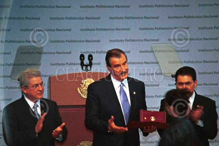 Vicente Fox acompañado de Francisco Medellin Leal, oficial mayor de la secretaría de Educación Pública, y Migel Angel Correa Jasso, director general del IPN, hace entrega de la Presea "Lazaro Cárdenas" a Maria Isabel Wong, galardonada de la Escuela Nacional de Ciencias Biológicas del IPN. FOTO: Sandra Perdomo/CUARTOSCURO.COM