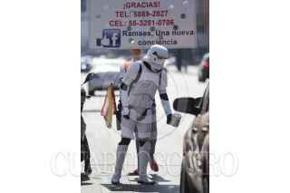 CIUDAD DE MÉXICO, 22ENERO2017.- Un hombre disfrazado como uno de los personajes de Star Wars, conocidos como ‘Stormtrooper’, pide un apoyo económico, al termino de Circuito Interior, para solventar un tratamiento médico para su hijo. FOTO: GALO CAÑAS /CUARTOSCURO.COM