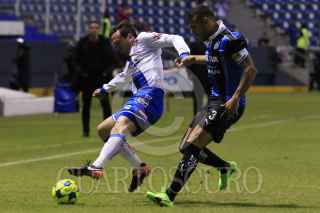 PUEBLA, PUEBLA, 22ENERO2017.- El jugador Jerónimo Amione, disputa el balón con MIguel Martínez en el juego entre el Club Puebla y los Gallos Blancos de Querétaro correspondiente a la jornada 3 del Torneo de Clausura de la Liga MX celebrado en el estadio Cuauhtémoc. FOTO: HILDA RÍOS / CUARTOSCURO.COM