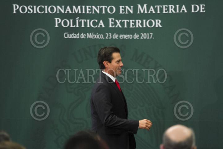 CIUDAD DE MÉXICO, 23ENERO2017.- Graco Ramírez, gobernador de Morelos y presidente de la Conago; Luis Videgaray, secretario de Hacienda, y Enrique Peña Nieto, Presidente de México, durante el anunció del posicionamiento en materia de política exterior, en la residencia oficial de Los Pinos. FOTO: MOISÉS PABLO /CUARTOSCURO.COM