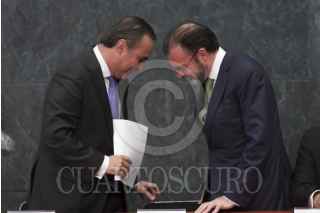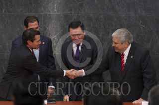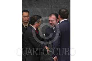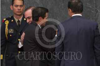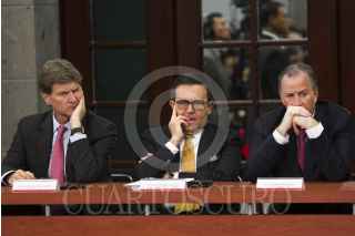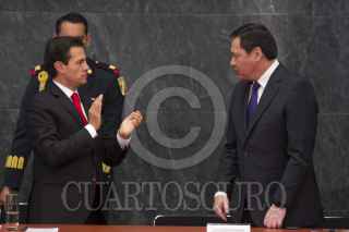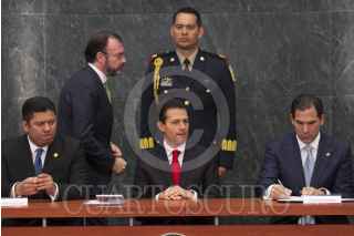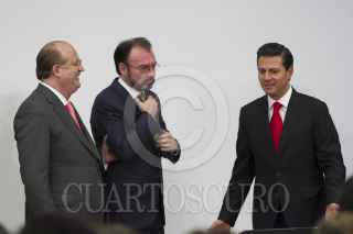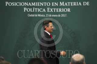 CIUDAD DE MÉXICO, 23ENERO2017.- Graco Ramírez, gobernador de Morelos y presidente de la Conago; Luis Videgaray, secretario de Hacienda, y Enrique Peña Nieto, Presidente de México, durante el anunció del posicionamiento en materia de política exterior, en la residencia oficial de Los Pinos. FOTO: MOISÉS PABLO /CUARTOSCURO.COM