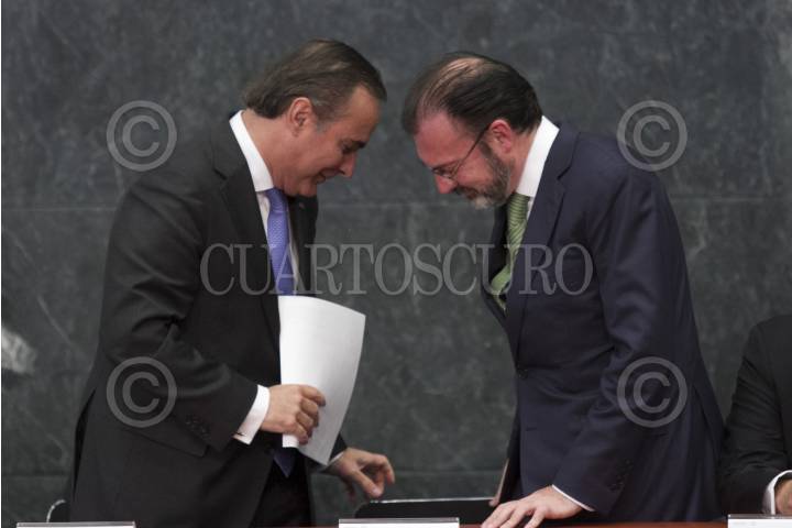 CIUDAD DE MÉXICO, 23ENERO2017.- Graco Ramírez, gobernador de Morelos y presidente de la Conago; Luis Videgaray, secretario de Hacienda, y Enrique Peña Nieto, Presidente de México, durante el anunció del posicionamiento en materia de política exterior, en la residencia oficial de Los Pinos. FOTO: MOISÉS PABLO /CUARTOSCURO.COM
