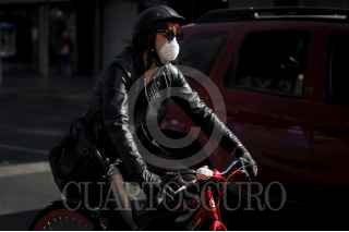 CIUDAD DE MÉXICO, 26ENERO2017.- Utilizando un tapabocas por los altos índices de contaminación, una joven circula en su bicicleta sobre la calle Pino Suárez, del centro histórico. FOTO: DIEGO SIMÓN SÁNCHEZ /CUARTOSCURO.COM