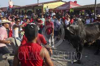 TLACOTALPAN, VERACRUZ, 01FEBRERO2017.- Cientos de pobladores y turistas que llegaron a Tlacotalpan para celebrar el "Embalse de Toros" fueron sorprendidos por la nueva ley para la protección de los animales del estado de Veracruz. Los inconformes se manifestaron rompiendo las puertas del palacio municipal y lanzando piedras contra elementos de la Policía Ministerial, mientras que el alcalde Homero Gamboa fue retenido hasta que interviniera para soltar a los bovinos. La autoridad nada pudo hacer para evitar el espectáculo que terminó con un herido, detenidos y animales maltratados. FOTO: FÉLIX MÁRQUEZ /CUARTOSCURO.COM