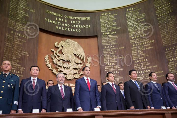 QUERÉTARO, QUERÉTARO, 05FEBRERO2017.- Durante la conmemoración del Centenario de la Constitución Política de los Estados Unidos Mexicanos, encabezada por el Presidente Enrique Peña Nieto, el Gobernador del Banco de México, Agustín Carstens Carstens presentó un billete de cien pesos y una moneda de 20 pesos, conmemorativos del centenario de la Carta Magna de 1917. FOTO: PRESIDENCIA /CUARTOSCURO.COM