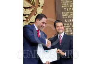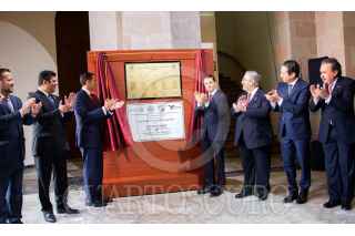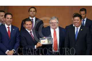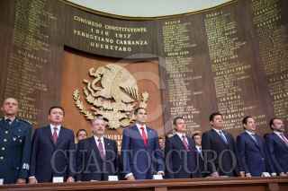 QUERÉTARO, QUERÉTARO, 05FEBRERO2017.- Durante la conmemoración del Centenario de la Constitución Política de los Estados Unidos Mexicanos, encabezada por el Presidente Enrique Peña Nieto, el Gobernador del Banco de México, Agustín Carstens Carstens presentó un billete de cien pesos y una moneda de 20 pesos, conmemorativos del centenario de la Carta Magna de 1917. FOTO: PRESIDENCIA /CUARTOSCURO.COM