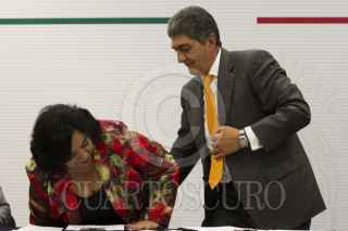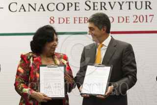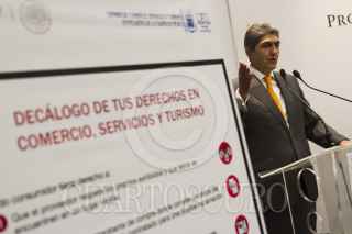 CIUDAD DE MÉXICO, 08FEBRERO2017.- Ada Irma Cruz, presidenta de Canacope, y Ernesto Nemer Álvarez, titular Procurador Federal del Consumidor, firmaron un convenio de colaboración, además presentaron el "Decálogo de tus derechos en comercio, servicios y turismo". Al finalizar la ceremonia oficial se dirigieron a un restaurante en la colonia Condesa donde colocaron el "decálogo". FOTO: MOISÉS PABLO /CUARTOSCURO.COM