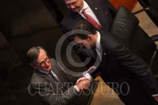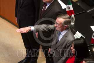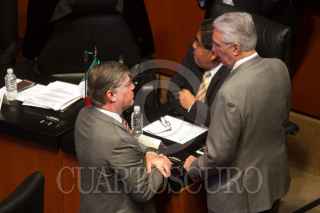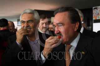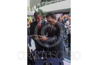 CIUDAD DE MÉXICO, 14FEBRERO2017.- Los senadores priistas Miguel Ángel Chico Herrera y Emilio Gamboa Patrón, observan vinos de Guanajuato, durante la inauguración de la exposición de productos de este estado, en la explanada del Senado de la República. FOTO: MOISÉS PABLO /CUARTOSCURO.COM