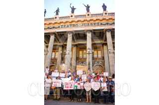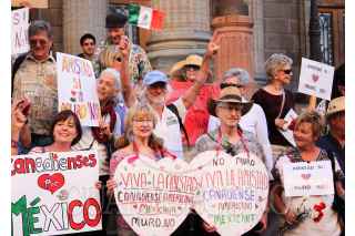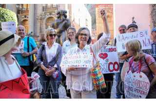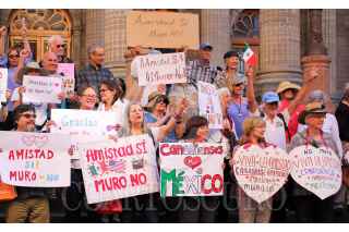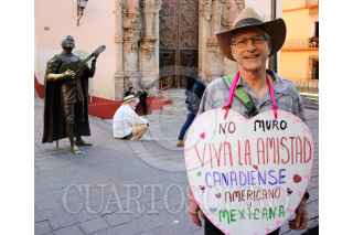 GUANAJUATO, GUANAJUATO, 14FEBRERO2017.- Norteamericanos residentes y turistas extranjeros realizaron una marcha que culminó en el Teatro Juárez para mostrar su amistad con los mexicanos y oponerse a la construcción del muro que planea Donald Trump, presidente de Estados Unidos. FOTO: GUSTAVO BECERRA /CUARTOSCURO.COM